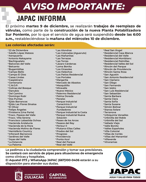 Culiacán, Sin.- JAPAC informa que como parte de los trabajos de construcción de la nueva Planta Potabilizadora Sur Poniente, se estarán llevando a cabo labores de reemplazo de válvulas, el próximo martes 9 de diciembre.