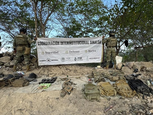 Personal de la Secretaría de Marina, en coordinación con el Ejército Mexicano, la Guardia Nacional, la Secretaría de Seguridad y Protección Ciudadana, la Fiscalía General de la República, la Fiscalía General del Estado y la Secretaría de Seguridad Pública del Estado, localizaron en el municipio de San Ignacio un campamento en el que se encontraron un arma larga, cargadores, cartuchos y equipo táctico.