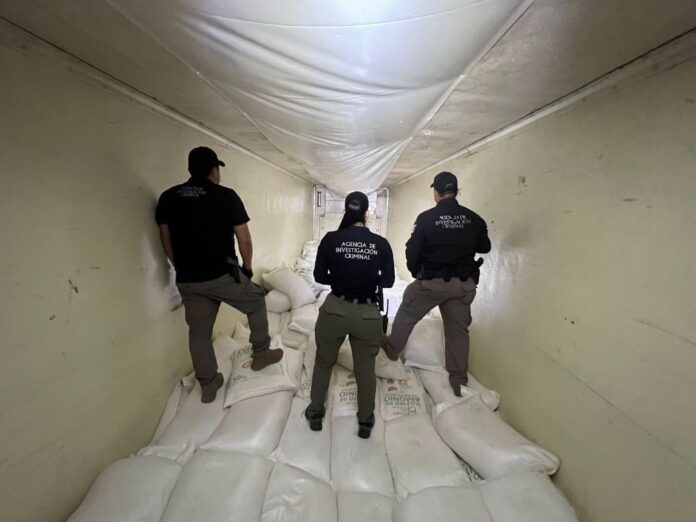 Autoridades aseguraron 320 kilos de metanfetamina ocultos en un tractocamión Volvo con caja refrigerada en Los Mochis, Sinaloa.