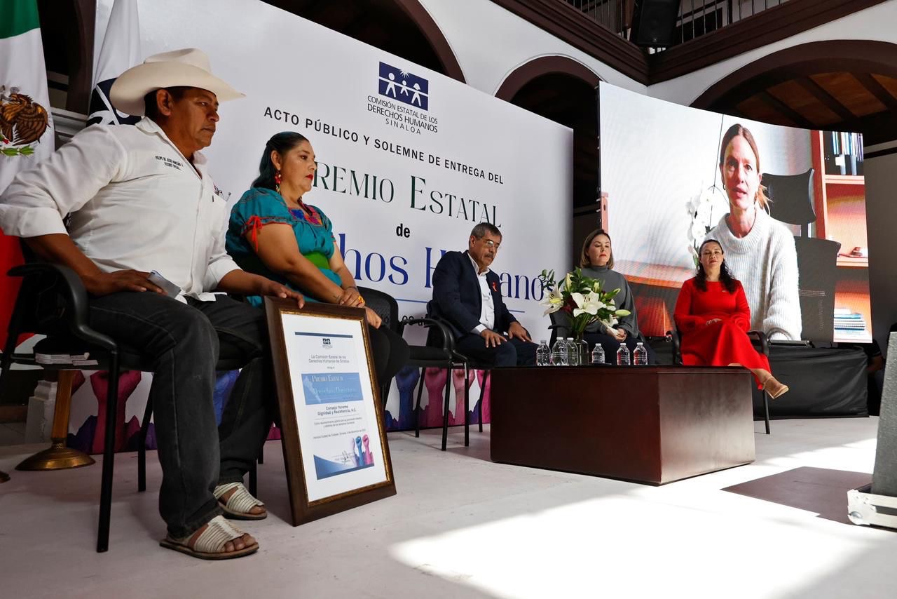 “A nombre del gobernador, el Dr. Rubén Rocha Moya, les expresamos nuestro reconocimiento más profundo al Consejo Yoreme, Dignidad y Resistencia, A.C. su labor honra a Sinaloa y fortalece nuestra vida democrática al recordarnos que los derechos humanos no se decretan, se defienden, se acompañan y se construyen en comunidad, a quienes hoy reciben este galardón gracias por su firmeza por su resistencia por su compromiso y por supuesto, por el amor a su pueblo este premio celebra su lucha y también su esperanza”, afirmó.