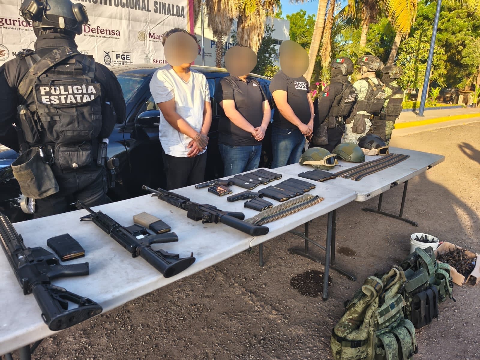 Asimismo, a través de labores de inteligencia en el despliegue para ubicar a los demás participantes en ese enfrentamiento, elementos del Grupo de Operaciones Especiales Sinaloa (GOES) de la Policía Estatal llegaron hasta el fraccionamiento Málaga Residencial, donde se ubicó a tres civiles armados presuntamente relacionados con el evento de seguridad de Santa Fe, a quienes se les aseguraron cinco armas y un vehículo.