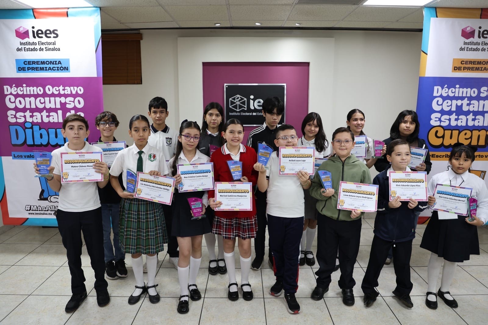 Culiacán, Sinaloa.- El Instituto Electoral del Estado de Sinaloa (IEES) premió a las niñas, niños y adolescentes sinaloenses que cursan el nivel de primaria, secundaria y Escuela de Arte, que resultaron ganadores del Décimo Sexto Certamen Estatal de Cuento “Escribo y comparto valores”, y Décimo Octavo Concurso Estatal de Dibujo “Los valores de la democracia””, convocatorias en las que se registraron 9 mil 939 dibujos y 6 mil 111 cuentos.