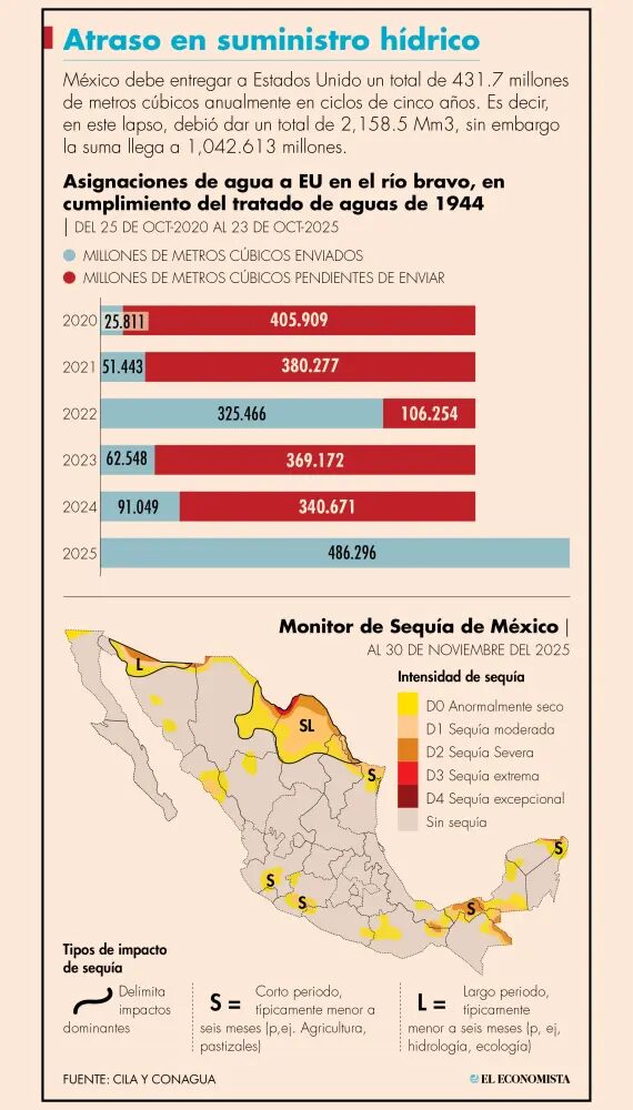 El agua adeudada corresponde al quinquenio que empezó en octubre del 2020 y concluyó el mismo mes de este 2025. Según datos de la Comisión Internacional de Límites de Aguas (CILA), en dicho lustro se entregaron a Estados Unidos 1,042 millones 613 metros cúbicos (Mm3), es decir, está pendiente el 50% del agua que México debe enviar a Estados Unidos.