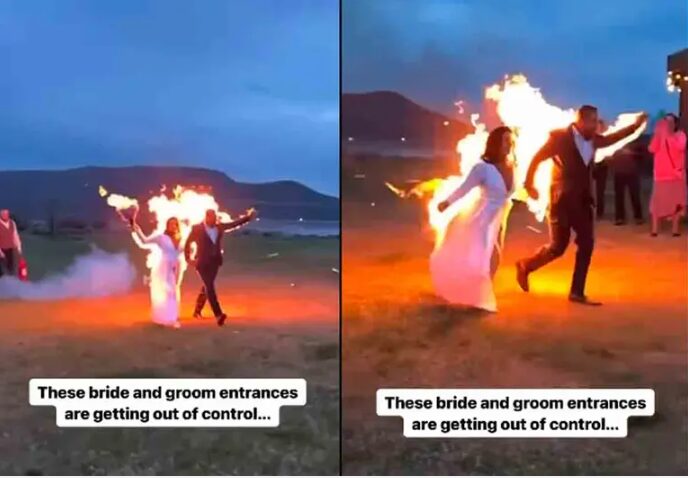 El clip muestra a los novios caminando tomados de la mano hacia su ceremonia al aire libre, sonrientes y saludando como si nada, mientras un velo de fuego los envuelve desde la espalda, lo que debía ser un momento romántico se transformó en un espectáculo que muchos calificaron como impresionante y otros como innecesariamente peligroso.