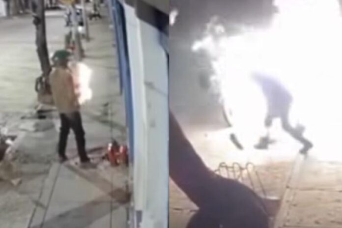 Por medio de un video se puede ver como un delincuente intentó incendiar un local comercial dedicado a la venta de motocicletas, pero terminó prendiéndose fuego él mismo.