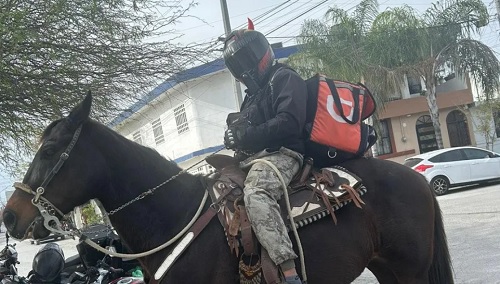 A través de redes sociales, el hecho registrado en el municipio de Juárez se ha vuelto viral en redes sociales, ya que no es común que tu comida llegue por medio de un caballo.