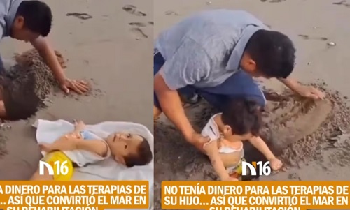 “Hola amigos, ¿cómo están? Aquí estamos enterrando al niño en la playa, lo venimos a enterrar a la playa para que él vaya agarrando fuercitas en su cuerpo y va a empezar a mejorar un poquito más. Yo creo que mi hijo ya va a caminar.”