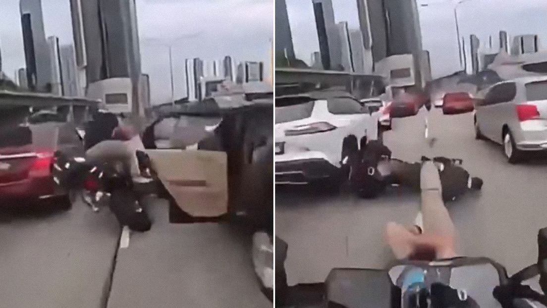 En una autopista de Kuala Lumpur, Malasia, un motociclista captó el momento en que, de repente, se abre la puerta trasera izquierda de un coche y derriba una moto que circulaba delante de él, lo que también provocó su caída al llevarse por delante a la víctima. En el accidente también resultaron implicados cuatro automóviles. La investigación preliminar señala que fue un niño de 2 años, sentado en el regazo de su hermano en el asiento trasero, quien abrió inesperadamente la puerta