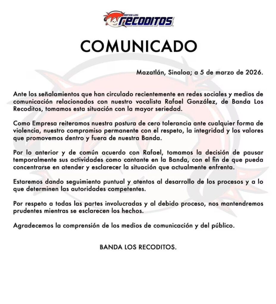 Horas antes del posicionamiento de Rafael González, Banda Los Recoditos emitió un comunicado oficial en el que reafirmó su postura de “cero tolerancia ante cualquier forma de violencia” y anunció la suspensión temporal de González como vocalista, decisión tomada en acuerdo con el propio cantante.