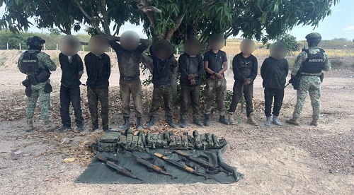 Personal del Ejército Mexicano, en coordinación con la Guardia Nacional, la Secretaría de Marina, la Secretaría de Seguridad y Protección Ciudadana, la Fiscalía General de la República, la Fiscalía General del Estado y la Secretaría de Seguridad Pública Estatal a través de la Policía Estatal Preventiva, detuvo a ocho civiles y les aseguraron armas largas, así como cartuchos, cargadores y chalecos tácticos.