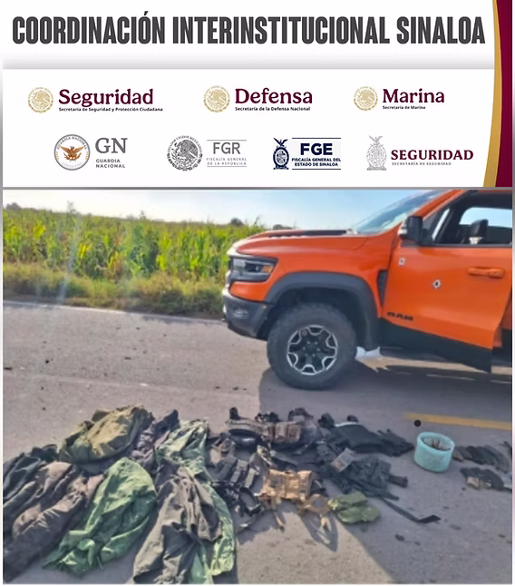 Navolato, Sinaloa.– Tras una agresión armada contra personal militar, autoridades del Grupo Interinstitucional lograron el aseguramiento de armamento, equipo táctico y un vehículo en las inmediaciones del poblado El Molino, en el municipio de Navolato.