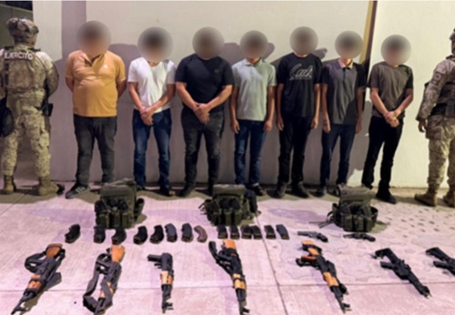 Personal del Ejército Mexicano, en coordinación con la Guardia Nacional, la Secretaría de Marina, la Secretaría de Seguridad y Protección Ciudadana, la Fiscalía General de la República, la Fiscalía General del Estado y la Secretaría de Seguridad Pública del Estado, a través de la Policía Estatal Preventiva, detuvieron a 7 civiles con armas de fuego, cargadores, cartuchos, chalecos tácticos y placas balísticas, al norte de Culiacán.