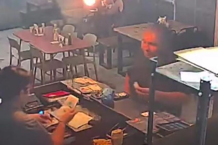 Frente a la cajera y su víctima, el individuo sacó su cartera y comenzó a pagar su pedido; sin embargo, en cierto momento de la interacción se dirigió con el mesero, a quien le pidió un vaso con agua, esto dicho por el propio restaurante.