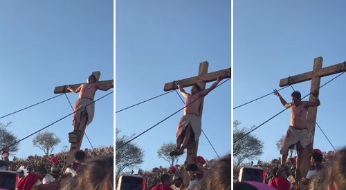 El percance ocurrió durante la escena de la crucifixión, específicamente cuando se realizaban las maniobras para levantar la cruz. En medio del proceso, el actor perdió estabilidad, lo que provocó su caída ante la mirada de los asistentes, quienes reaccionaron de distintas maneras ante la situación.