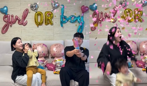 La familia organizó la revelación del sexo del bebé que esperan. En el video aparece la madre sosteniendo a su hijo pequeño mientras activan un dispositivo que libera papeles de color para anunciar la noticia.