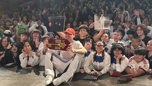 El momento más fuerte de la visita ocurrió cuando Peso Pluma ingresó al auditorio principal, donde cientos de adolescentes lo esperaban entre gritos de júbilo.