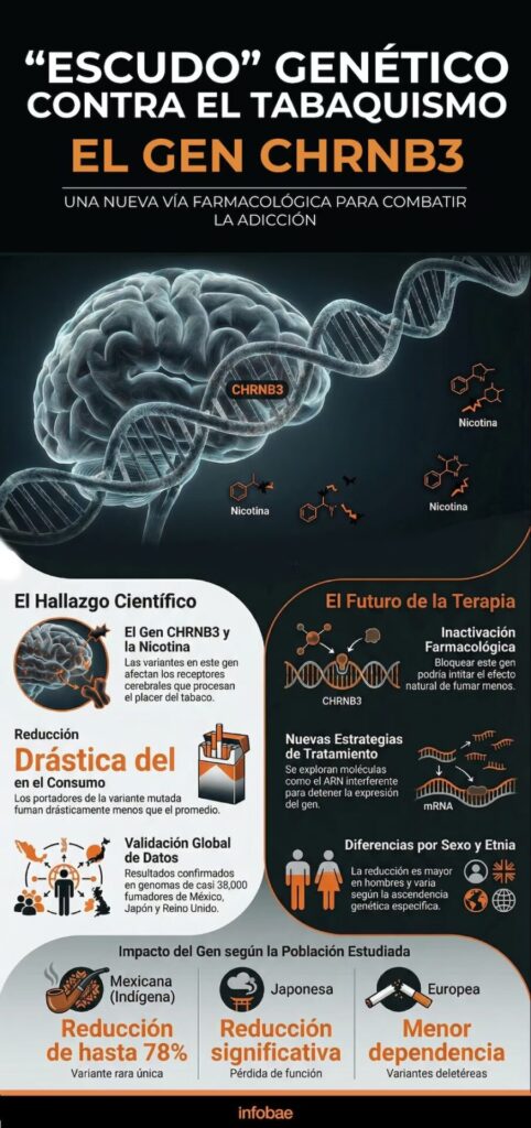 La investigación no se limitó a los datos mexicanos. En el Biobanco de Japón, los científicos hallaron otra variante de pérdida de función en CHRNB3 asociada con una reducción significativa en el consumo diario de cigarrillos. Esta mutación fue más frecuente en participantes de ascendencia del este asiático, pero rara en otras poblaciones. En el Biobanco del Reino Unido, variantes deletereas raras y variantes de pérdida de función de CHRNB3 también se vincularon a un menor consumo de cigarrillos en personas de ascendencia europea.