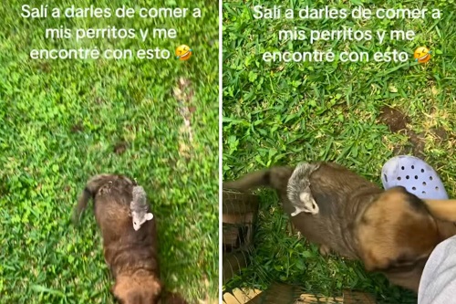 De acuerdo con el testimonio del creador del contenido, el hallazgo ocurrió cuando salió a alimentar a sus perros. En ese momento notó que uno de los cachorros tenía una pequeña zarigüeya sujetándose firmemente a su espalda.
